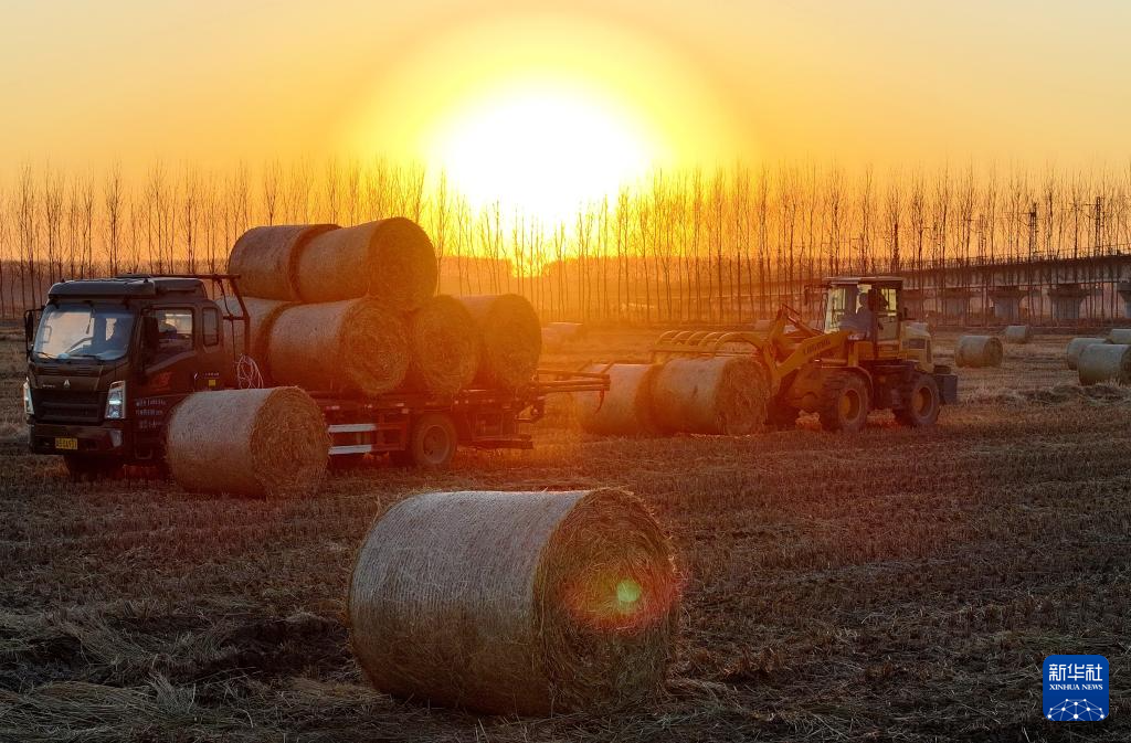 2025年12月27日,稻草回收企业的工人在河北省唐山市丰南区西葛镇的田间将打包好的水稻秸秆装车转运(无人机照片)。