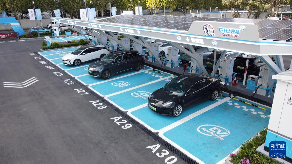 这是安徽石油大众综合能源站内的充电车棚,车棚也可作为光伏发电站(2023年11月17日摄,无人机照片)。