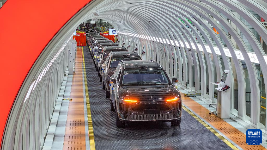 在位于重庆市两江新区的赛力斯汽车超级工厂,新能源汽车即将下线(2025年9月19日摄,无人机照片)。