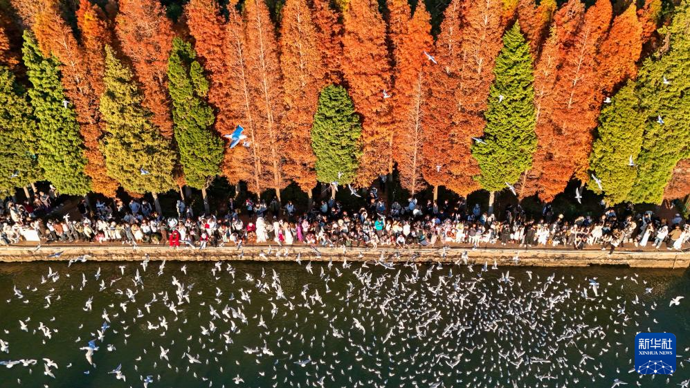 2025年12月10日,游客在云南省昆明市滇池畔的海洪湿地公园喂红嘴鸥(无人机照片)。