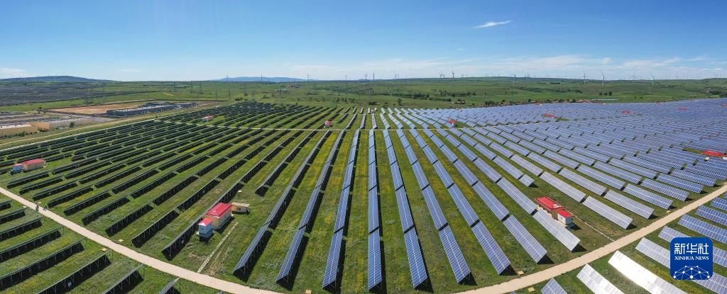 在河北省张家口市,光伏板整齐排列在国家级可再生能源示范区内(2023年8月18日摄,无人机照片)。
