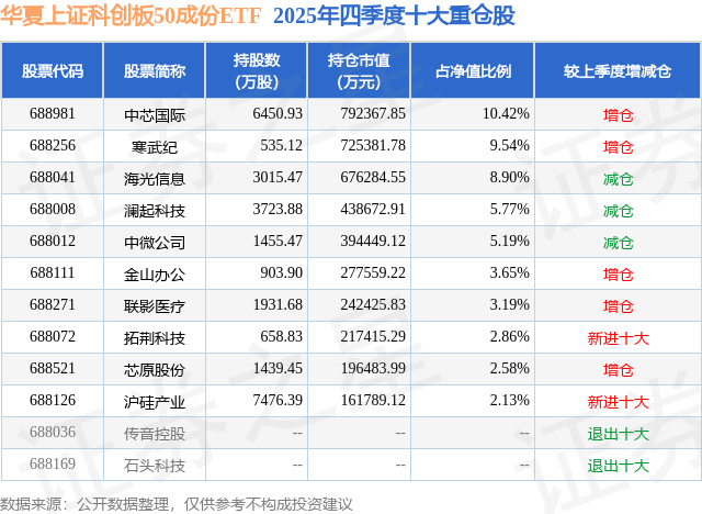 华夏上证科创板50成份ETF的前十大重仓股如下: