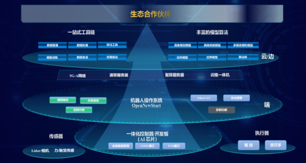 “云网”坚实高效协同。中兴通讯具备构建全栈国产化智算集群能力,已落地多个大规模国产化智算中心项目,为具身智能大模型的训练与推理提供强大、自主、安全的算力保障。同时,依托5G-A/6G技术的超低时延、高可靠、大带宽特性,构建云-网-边-端协同框架,实现云端智慧与机器人本体敏捷的高效联动,为多机器人协同作业、远程实时操控提供确定性连接保障,夯实产业规模化应用的网络基础。