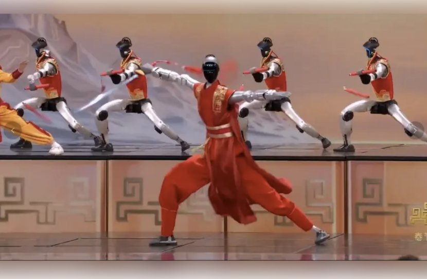 宇树机器人在马年央视春晚中表演“武BOT”,机器人演示了翻筋斗、舞棍、跑跳空翻、舞剑等武术高难度特技动作。(央视截屏)