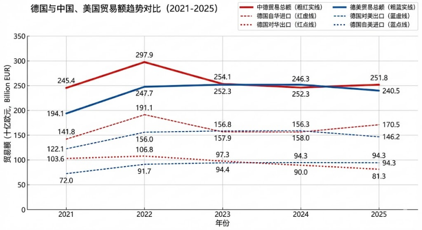 2021-2025中德、德美贸易额趋势对比(@心智观察所制图,综合德国联邦统计局以及海关总署最新统计数据)