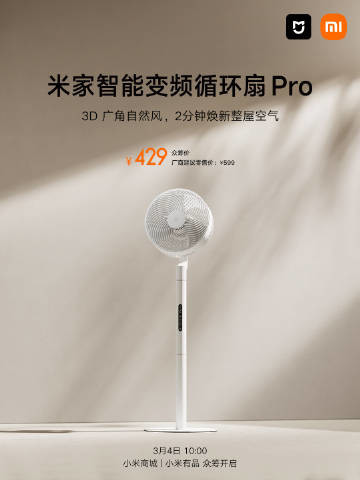 2月25日,小米官方宣布,米家智能变频循环扇Pro开启众筹预约,众筹到手价仅429元。
