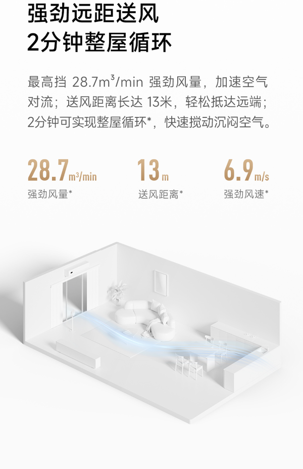 在气流性能上,这款循环扇最高挡风量达28.7m3/min,送风距离可达13m、风速6.9m/s,20m2层高2.8m的房间2分钟即可实现整屋空气循环。搭载3D自动摇头扫风设计,支持上下100°、左右 120° 大广角摇头,还可通过米家App以10°为单位精准调控扫风角度,凉感覆盖更全面;内置4种自然风感,模拟户外舒适气流,搭配空调使用时,能让室内60分钟冷热均匀度提升57%,助力空调省电19%,打造更舒适的室内温度环境。