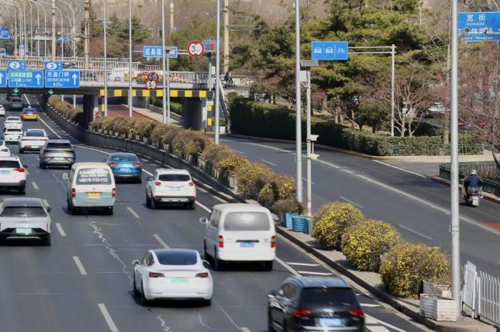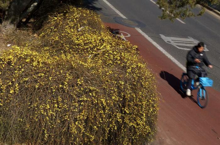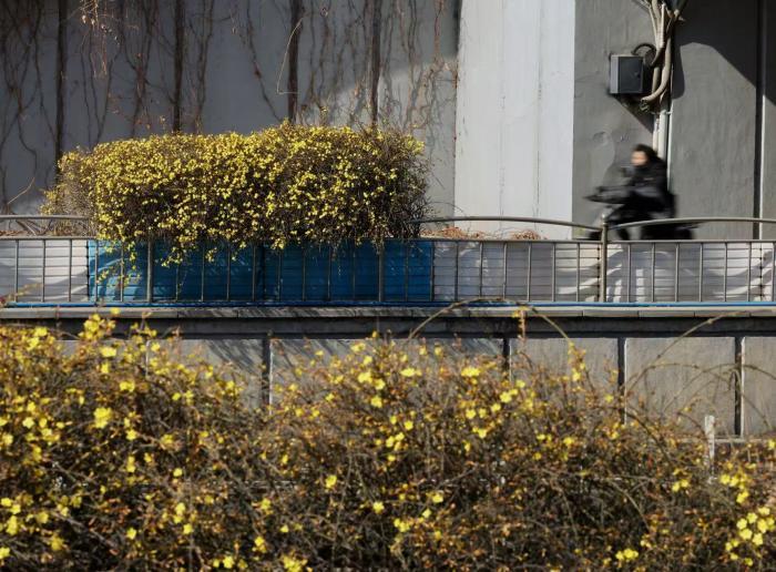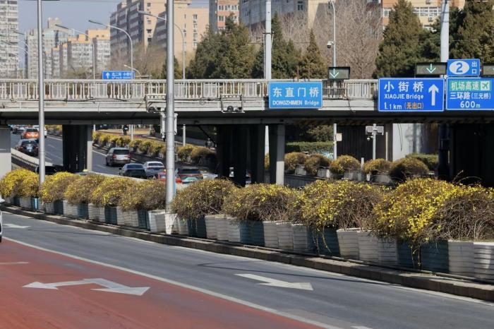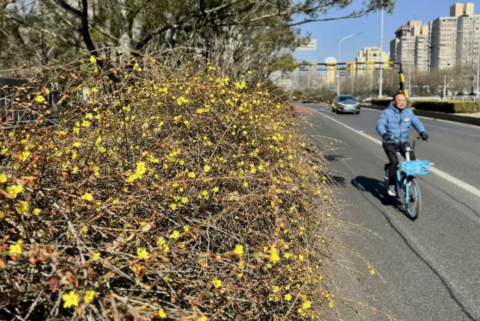 2月24日,北京二环路辅路沿线迎春花陆续开放,金黄花朵缀满枝头,为城市主干道披上早春新装。北京青年报记者走访东二环、西二环多处路段看到,朝阳门、东直门、西直门等桥段花量集中,形成绵延数公里的带状花景,与车流、绿道相映成趣。