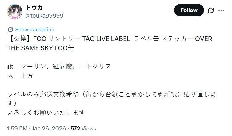 大意:交换FGO×三得利TAG LIVE LABEL标签罐贴纸,出让: 梅林、红阎魔、尼托克丽丝,求换 土方 ;图片来源:X@ トウカ