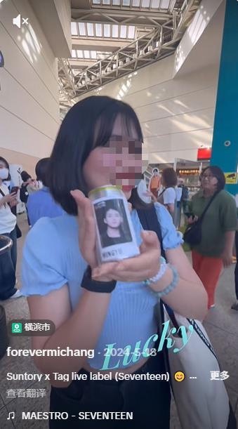 比如这位TikTok用户,从一台韩国男团SEVENTEEN主题的自动贩卖机中,买到了一罐印有该男团某位成员照片的饮料。