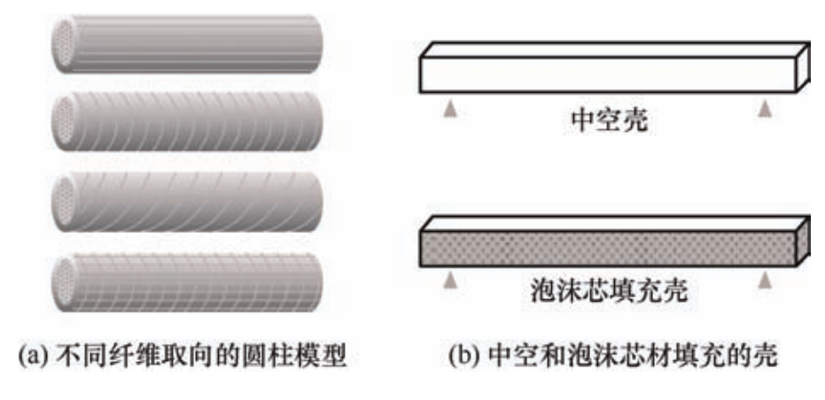 基于羽轴结构,SULLIVAN 等人提出了四种不同纤维取向的圆柱设计,如图3(a)所示;受羽杆泡沫状腔室结构启发,设计了填充泡沫芯材的薄壁方形截面壳,如图3(b)所示,通过三点弯曲试验,证实了泡沫芯材的存在提高了吸能能力和承载能力。