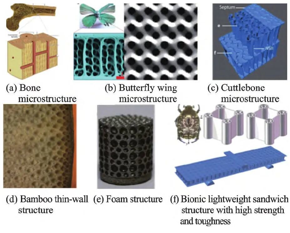 除了上文提到的几种仿生结构,自然界中还有许多其他的仿生微结构,例如:在轻量化和光学等领域有着广泛的应用的蝶翅结构;具有出色强度和能量吸收能力的墨鱼骨多孔微结构;根据竹壁微结构设计出含有类筛管的梯度竹子仿生微结构;具有更优异的韧性的仿鞘翅轻质高韧夹芯结构等等。