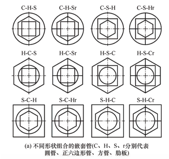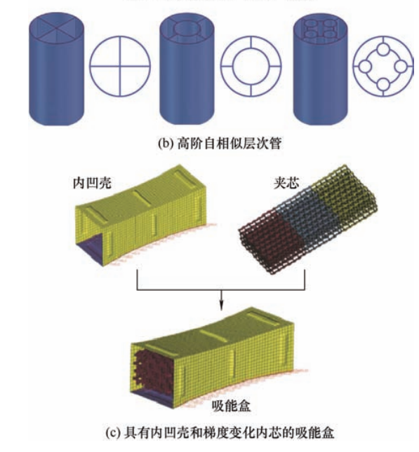 受骨骼结构的启发,NIKKHAH 等人提出了多种不同形状组合的嵌套管,如图4(a)所示,发现由外到内依次是方管、正六边形管和圆管并且带增强肋板的嵌套管具有最显著的吸能特性。ZHANG 等则是构造了一种高阶自相似层次管,如图4(b)所示,并通过迭代将内部肋板的连接替换为相似的圆管连接,发现二阶分级圆管的能量吸收明显大于非分级结构,并且小圆直径和壁厚对吸能有显著影响。WANG 等以人体胫骨为仿生原型,提出了一种由内凹壳和内芯组成的新型吸能盒,如图4(c)所示,其中,内芯具有梯度分布和负泊松比的特征。通过性能分析,发现壳体厚度和内芯的梯度厚度对吸能盒的吸能有较大的影响。