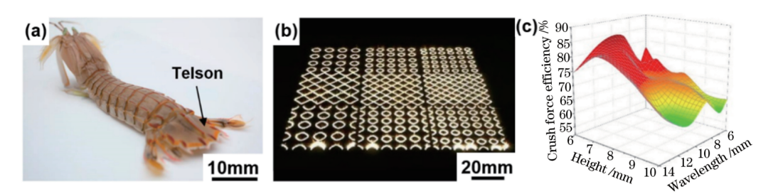 考虑口足目生物口虾蛄(别称皮皮虾)尾节,如图6(a)所示,其独特的生物结构能使其抵抗竞争捕食过程中超过1500 N、23 m/s 的冲击力,其能量吸收机理类似于沙袋,本身吸收和消散能量,而不使能量反向传递。通过解析皮皮虾尾部的宏观构型,有研究团队设计了一种仿生双向波纹板结构,揭示了高度和波长两个结构变量对仿生结构在冲击载荷作用下的比能量吸收(SEA)冲击力效率(CFE)及应力分布的影响规律,表明其具有优良的能量吸收能力及抗冲击稳定性。