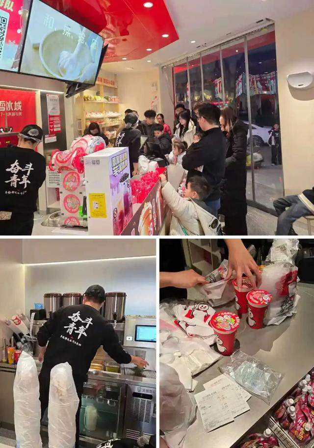 ◎天黑了,蜜雪冰城店里挤满了等餐的人