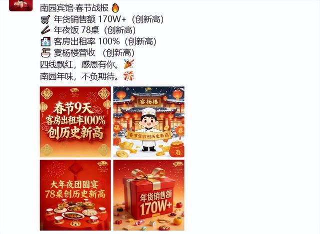 苏州是新一线城市,其中南园宾馆是苏州城区唯一的园林别墅式国宾馆。今年新春,各类数据创造新高,年货销售额170W+,年夜饭78桌,客房出租率100%……