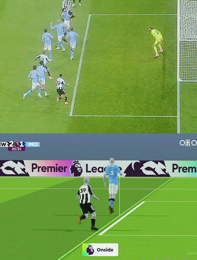 去年11月英超第12轮,曼城客场1-2不敌纽卡的比赛里,这种偏差就被直观地展现出来。半自动越位系统裁定巴恩斯的制胜球不越位,进球有效,但眼尖的球迷发现,系统生成的越位瞬间画面显示曼城后卫鲁本-迪亚斯明显腾空,而电视转播画面里他却几乎没有离地。