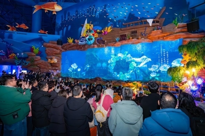 海陆仙年,双园共沸。陆乐园新春氛围日嗨夜闹,海世界亮点频出,颇受亲子家庭青睐。全国首个“宋词沉浸式水下剧场”《蝶恋花·清照一梦》每日演出3场,场场爆满。该剧以李清照词作为创作蓝本,通过水下光影、人鱼表演、宋风美陈等多元形式,将古典诗词意境具象化呈现,成为亲子家庭游客的热门打卡项目。明星IP“胖人鱼的海洋奇梦”累计互动20余场,“萌宠大拜年”活动也深受大小朋友们的热捧。