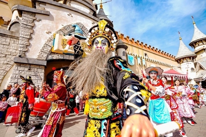 春节期间,乐园演出场次密集,内容丰富多彩。园区每日安排各类演出50余场次,累计演出总场次突破350场。从核心演艺《梦回西楼》《西游大联欢》到非遗传承项目《陕北秧歌》《京剧战鼓》《潮汕英歌舞》,从白天的巡游互动到夜间的“蹦仙迪”潮流派对,全天候、多时段的演艺安排满足了不同年龄段游客的观赏需求。