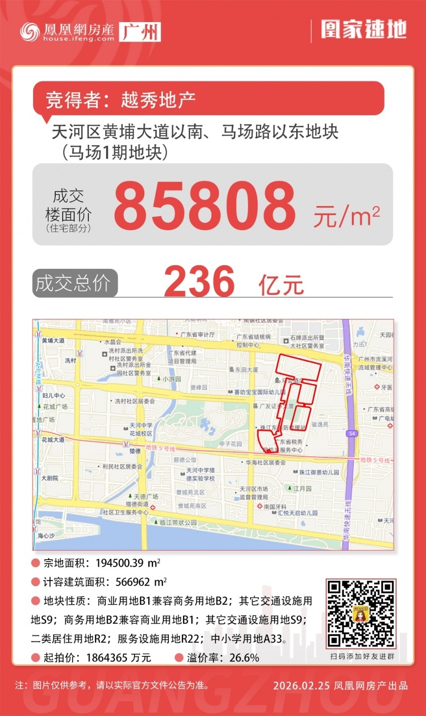 2月25日10时,天河区黄埔大道以南、马场路以东地块(马场1期地块)限时竞拍,经过10.5小时,243轮竞拍,最终由广州越诚达有限公司 ,归属越秀地产,以总价236亿元竞得,按商业部分恒定为18196元/平计算,扣除配建后,折合住宅楼面价为85808元/平。