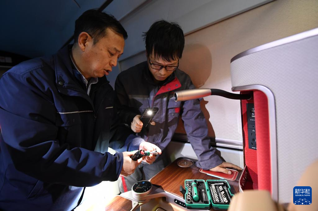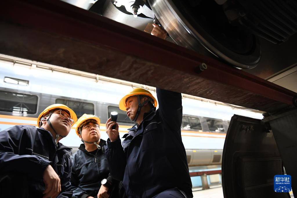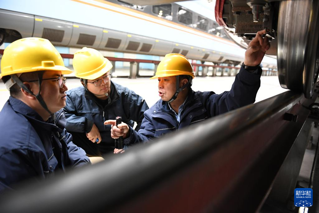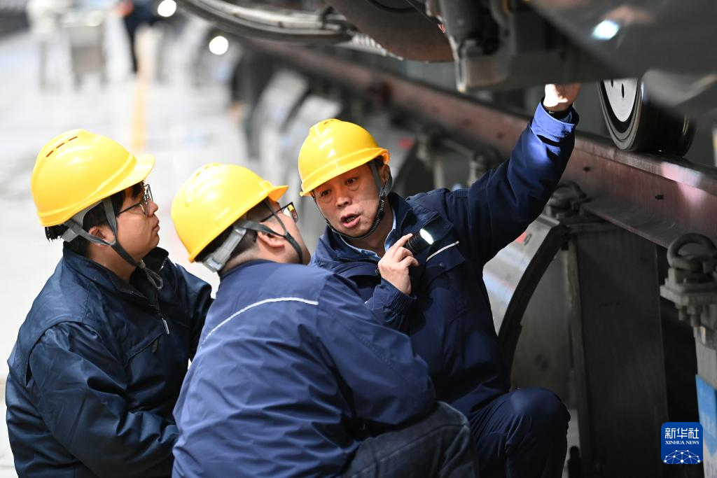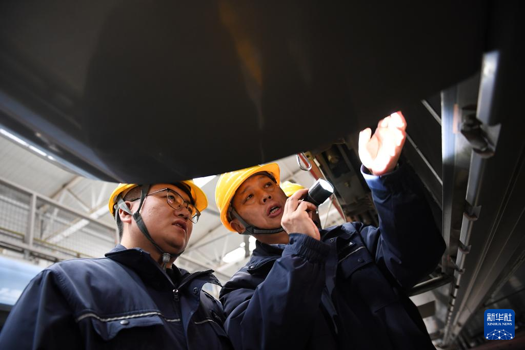 1月14日,在位于中国铁路西安局集团有限公司西安动车段的动车组检修库,董宏涛(右)和青年职工一起检修动车组列车。