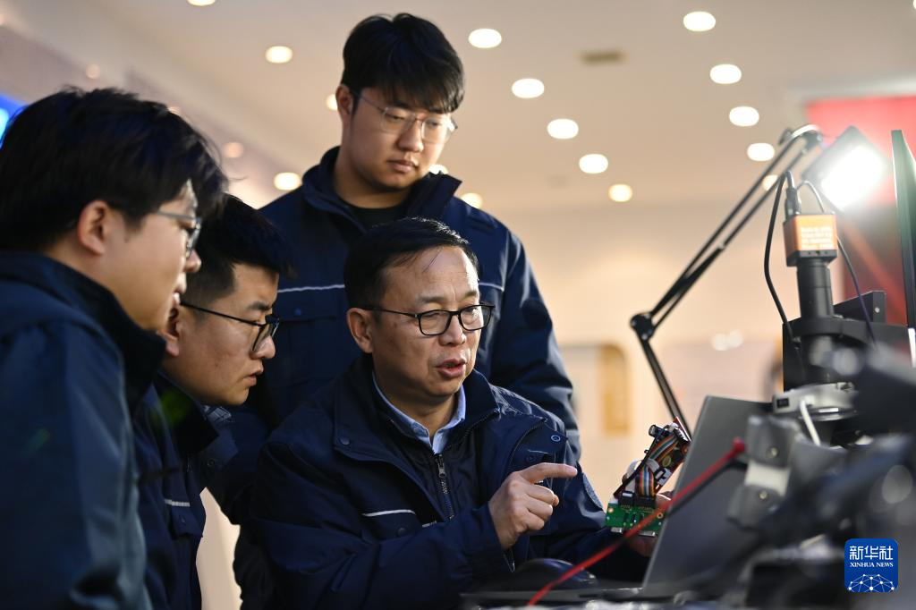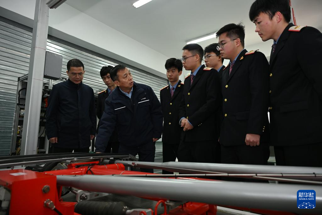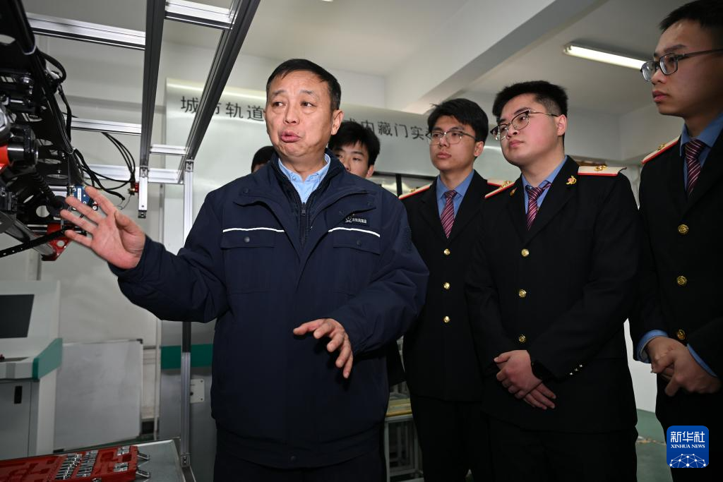 2月4日,在位于陕西省渭南市的陕西铁路工程职业技术学院实训室,董宏涛(左三)与师生交流。