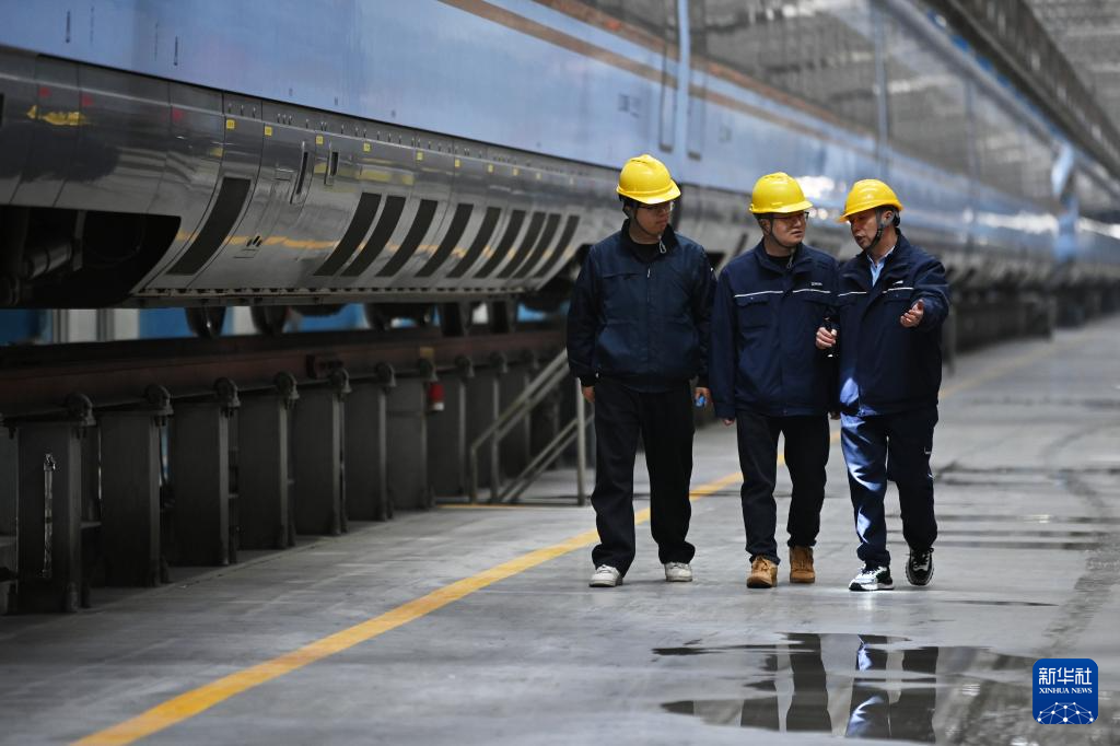 1月14日,在位于中国铁路西安局集团有限公司西安动车段的动车组检修库,董宏涛(右)和青年职工探讨业务。