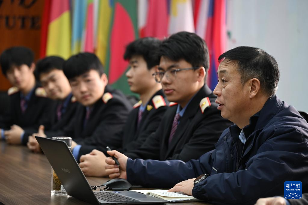 2月4日,董宏涛(右一)在位于陕西省渭南市的陕西铁路工程职业技术学院和学生交流。