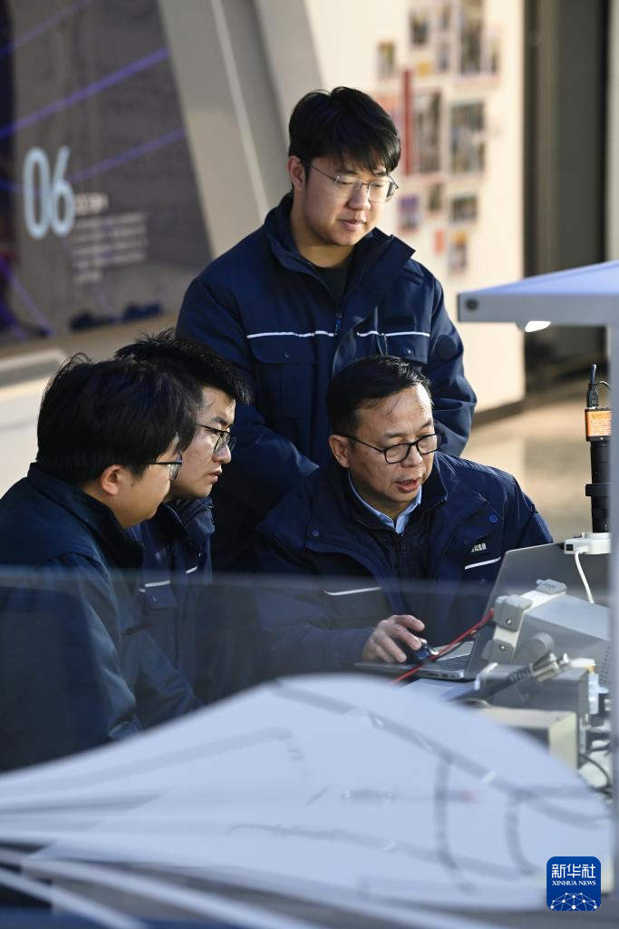 1月14日,在位于中国铁路西安局集团有限公司西安动车段的董宏涛国家级技能大师工作室,董宏涛(左二)指导工作室成员研究检修业务。