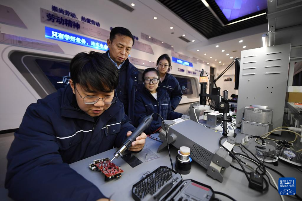 2月4日,在位于陕西省渭南市的陕西铁路工程职业技术学院实训室,董宏涛(前左一)为学生指导业务。