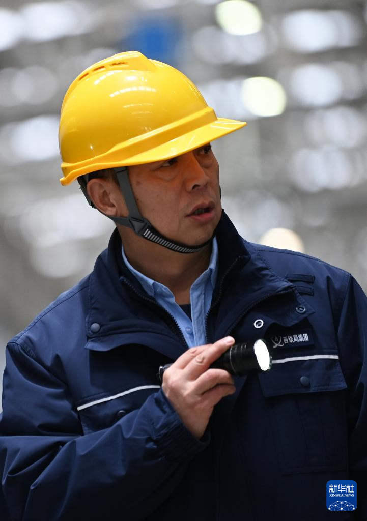 1月14日,董宏涛在位于中国铁路西安局集团有限公司西安动车段的动车组检修库检查列车。