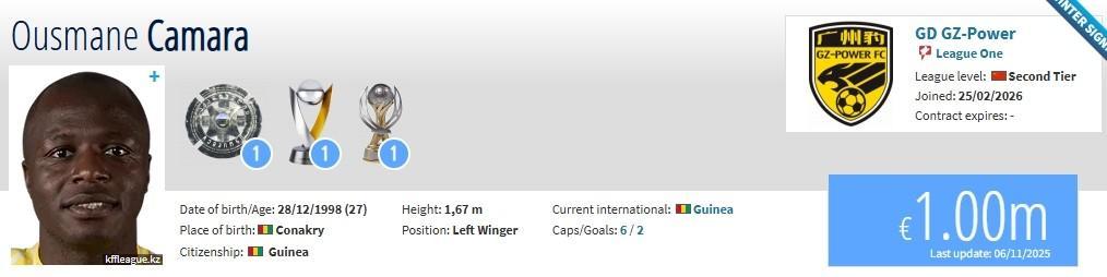 北京时间2月25日,德转更新,阿斯塔纳边锋奥斯曼-卡马拉加盟广东广州豹,转会费80万欧。