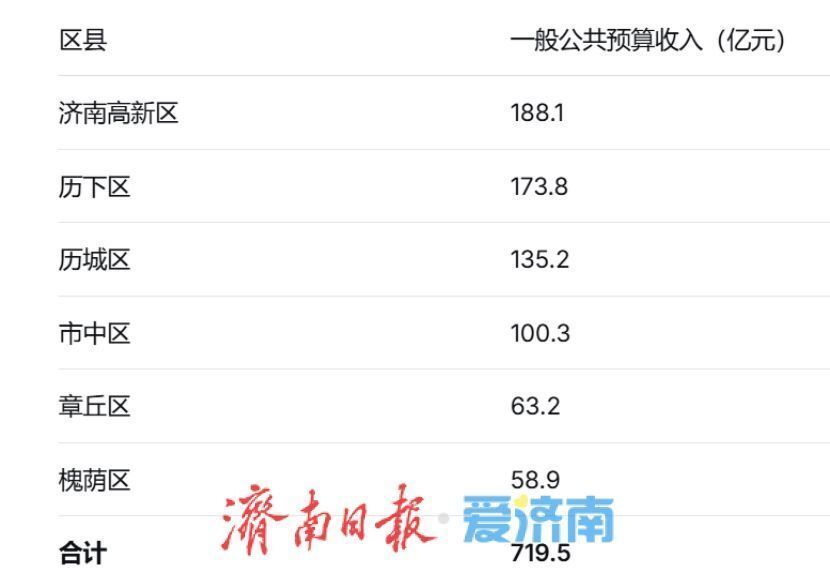 2025年,济南市一般公共预算收入为1093.4亿元,上述六区县合计719.5亿元,全市占比高达65.8%。