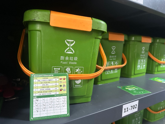 左岸B区共有16栋楼、1201户,先期选取11号楼作为试点。小区为每户免费配备两个专用小厨桶,家里放一个用于日常收集,满了就送到分类点存入专用存放柜,干净又便捷。为调动积极性,街道、社区定下暖心规则:投放一次积1分,分拣达标、现场整改后仍可积分,攒够积分就能兑换鸡蛋、肥皂、卫生纸、洗洁精等日用品,真正让“分类”变“实惠”。