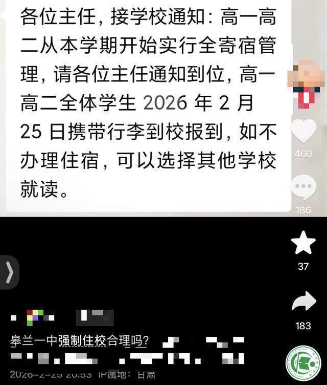 校方的通知截图显示:“接学校通知,高一高二从本学期开始实行全寄宿管理,请各位主任通知到位,高一高二全体学生2026年2月25日携带行李到校报到,如不办理住宿,可以选择其他学校就读。”