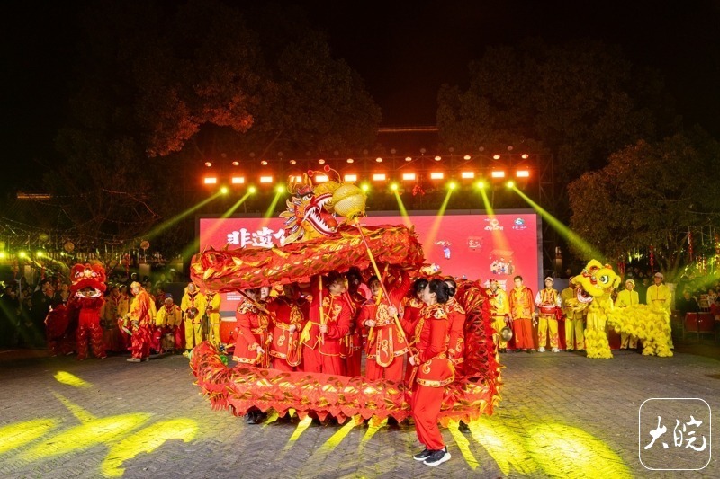 25日傍晚6时许,表演尚未开始,现场已人山人海,热闹非凡。晚间7时整,民俗展演正式拉开帷幕。舞龙队员身着鲜艳喜庆的服饰,两条数米长的巨龙随着表演者的舞动上下翻腾着,从桥上走下,穿过“龙门”,不停变换各种形态,在舞台中央为观众呈现了一场视听盛宴。