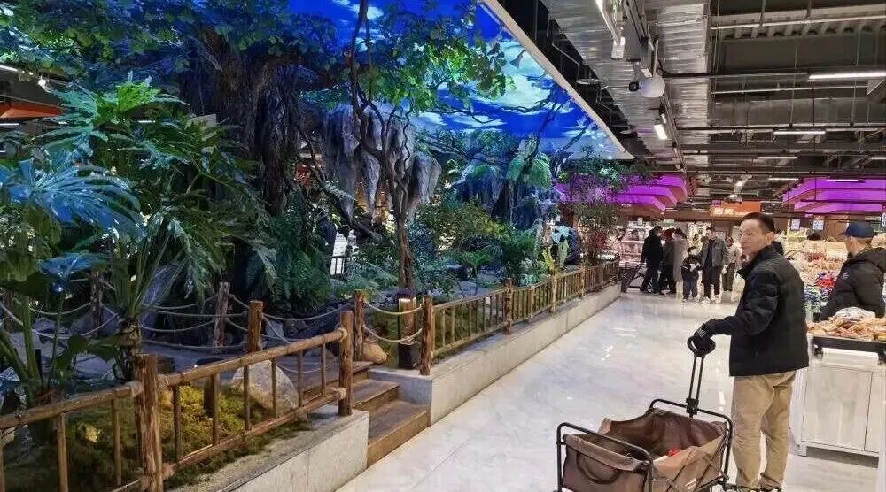 农夫刘先生更是开创了“公园式卖场”,在动线上植入山水造景。超市里设置了一条数十米长的“山水景观区”,在逛超市的同时能够欣赏假山、流水、小桥和绿植,甚至还设置了模拟四季变化的树木造景。
