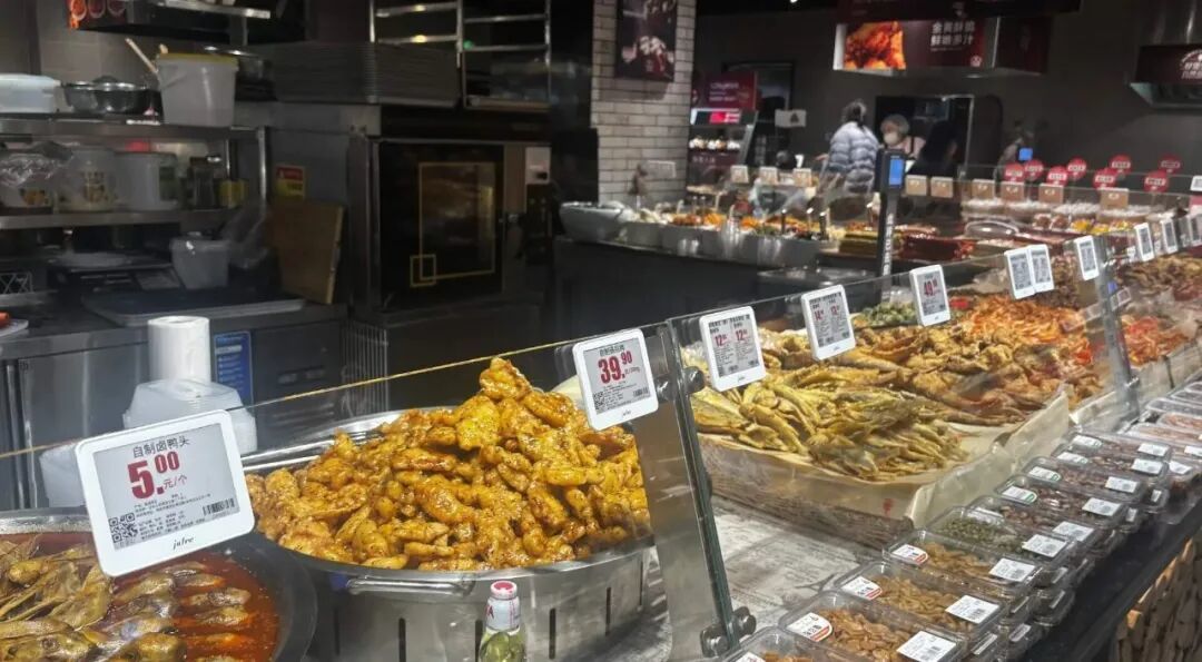熟食与现制餐饮被放到核心位置,鲜肉、卤味凉菜、果切等不易保存的食物,全部由散装称重改为净包装。
