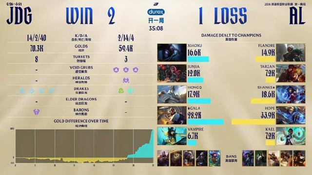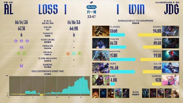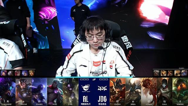 前期AL尝试动JDG下路双人组动出了事情,AL野辅都被击杀,格温因此在上路发育没有受到任何干扰,AL的龙魂团上,Gala一波烟花拿下三杀,JDG转头收下大龙。但紧接着的下一波,Flandre奎桑提掰到了厄斐琉斯将其击杀,AL打出1换3。最后一波JDG抓死Shanks后尝试一波成功,3-2战胜AL晋级胜者组决赛!
