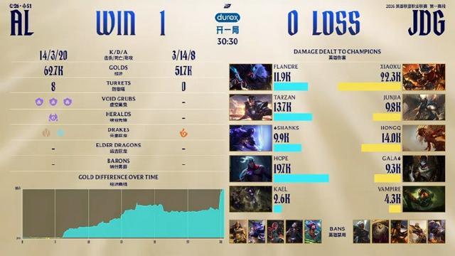 前期Tarzan赵信击杀Junjia潘森拿下一血,AL在打野位上的领先非常大,接下来几波团战Flandre的挖掘机在团战中都精准地找到了JDG的双C,虽然Tarzan浪了一波但还是无伤大雅,AL拿下第一局的胜利!