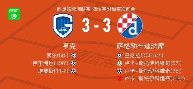 北京时间2月27日欧足联欧洲联赛 淘汰赛附加赛次回合,亨克对阵萨格勒布迪纳摩。亨克索尔破门,伊东纯也破门,埃曼斯破门。萨格勒布迪纳摩巴克拉尔破门,卢卡-斯托伊科维奇梅开二度。最终比分亨克 3-3 萨格勒布迪纳摩。两回合总比分亨克6-4萨格勒布迪纳摩。