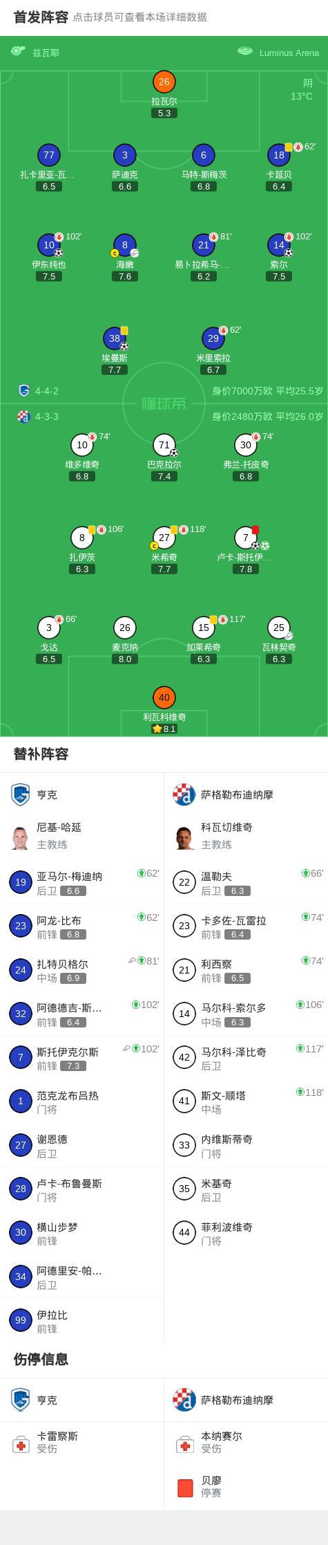 第105分钟,萨格勒布迪纳摩球队卢卡-斯托伊科维奇吃到红牌。