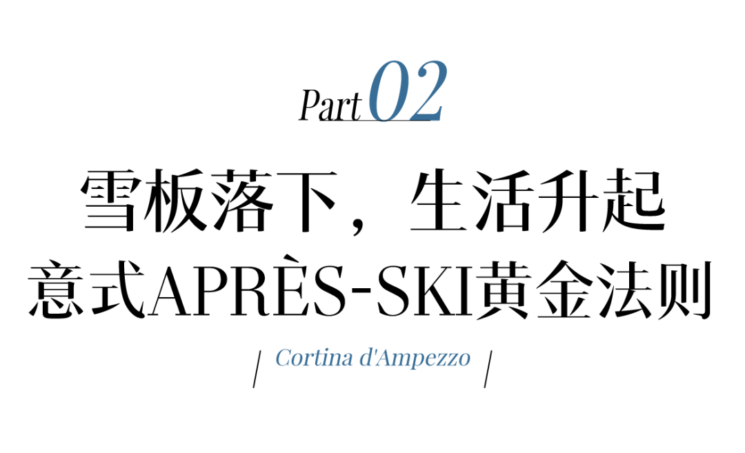 aperitivo文化是科尔蒂纳Aprés-ski的核心。aperitivo原本是意大利人餐前饮用的开胃酒,如今已演变成一种社交仪式。Aprés-ski源自法语,如今已成为欧洲雪山度假的标志性文化,但在不同国家有着截然不同的风格与气质。奥地利的Aprés-ski是啤酒厅的狂欢,施拉格音乐震天响,人们举着啤酒杯肆意舞动,热闹非凡却少了几分优雅;法国的Aprés-ski是时髦的代名词,DJ打碟搭配香槟蹦迪,灯光闪烁间尽显潮流气息,却总少了点人间烟火;而意大利科尔蒂纳的Aprés-ski,将aperitivo文化、阿尔卑斯山珍与雪山露台完美融合,在松弛与精致之间找到了绝佳平衡。