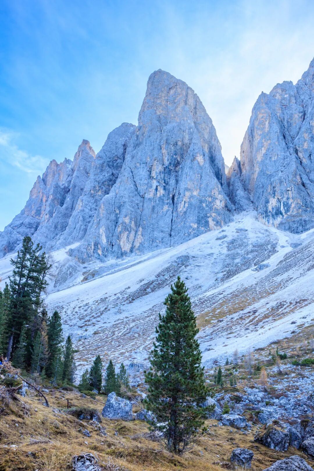 脚下的白云岩,是多洛米蒂最古老的讲述者。这些岩石曾深埋史前海底,是远古珊瑚的遗迹,经岁月抬升才屹立山间。在拉迪纳人口中,它曾是“暗沉的山墙”,直到一位倾慕月之公主的王子,恳求矮人族群以魔法拂去岩间树影,才让山体透出莹白微光,成了如今被阳光遍吻的“苍白山脉”。
