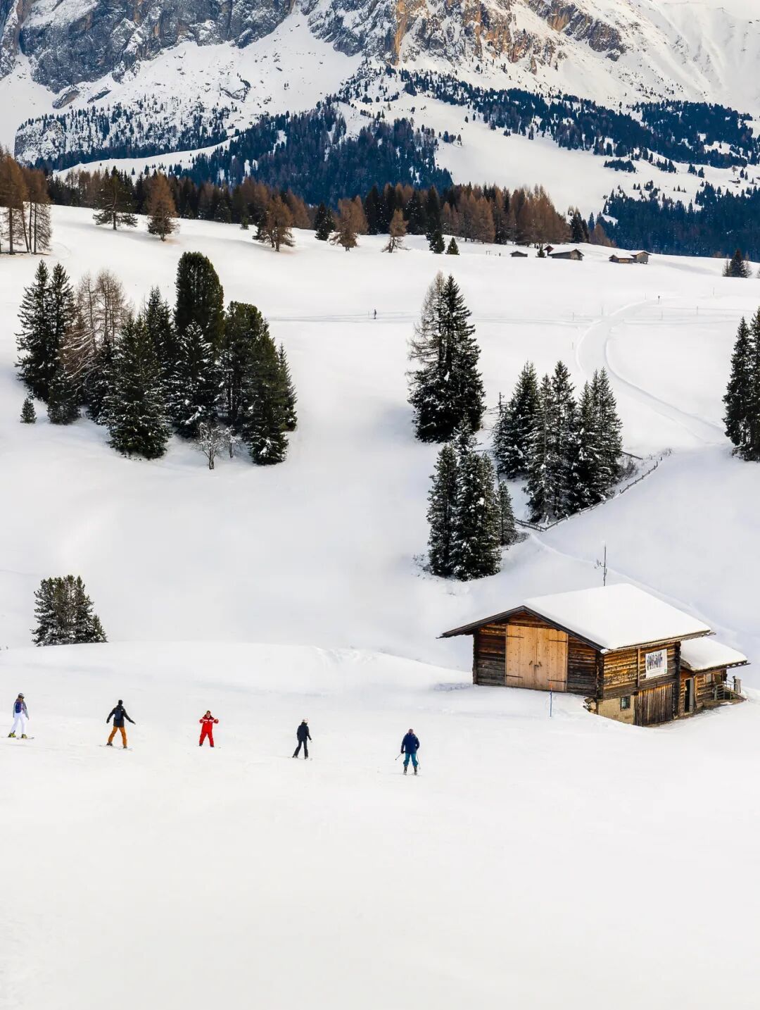 最令人心动的是,这条雪道的终点直接衔接高山木屋Rifugio Scoiattoli,省去了赶路的烦恼,实现了滑雪与Aprés-ski的无缝衔接。滑完雪,无需长途跋涉,只需几步便能走进温暖的木屋。坐在露台的长椅上,脱下滑雪靴,换上舒适的拖鞋,点一份炭烤野猪肉,搭配一杯醇厚的特伦蒂诺红酒,眼前是五塔山的壮丽全景,耳边是风雪掠过松林的轻响,那种松弛与惬意,正是科尔蒂纳独有的度假美学。