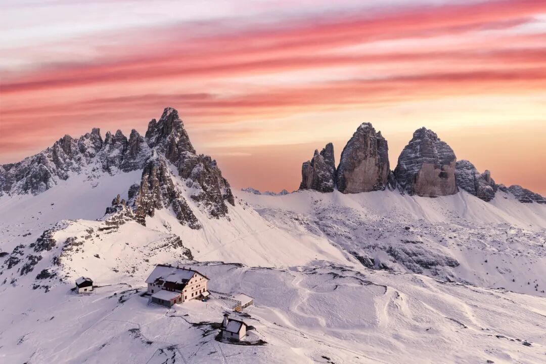 理解科尔蒂纳为何成为滑雪圣地,必须从认识多洛米蒂开始。这片山脉以18世纪法国地质学家德奥达·德·多洛米厄命名,其独特的白云岩构成了它标志性的浅色肌理,在日光下宛如“苍白山脉”。然而,自然的魔法在晨昏上演:当太阳光线低角度掠过,整片山体会被瞬间“点燃”,从柔和的粉金色渐变为炽烈的火红。这场每日两次的光影戏剧,被当地人称为 “Enrosadira”,阿尔卑斯夕照,也让这里的每一次滑行,都能邂逅粉金霞光相伴的浪漫。