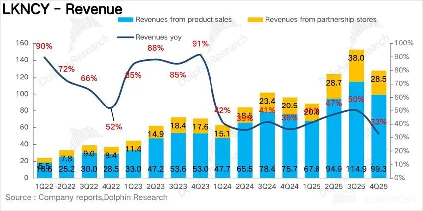 Q4瑞幸实现总营收127.8亿元,同比增长32.9%,不及预期。拆分业务来看,自营门店实现营收99亿元,同比增长31.2%,加盟业务收入28.5亿元,同比增长39.3%,增速快于自营门店的增长,核心还是在于2025年瑞幸系统性降低了加盟门槛,通过加盟模式加速下沉抢占点位。