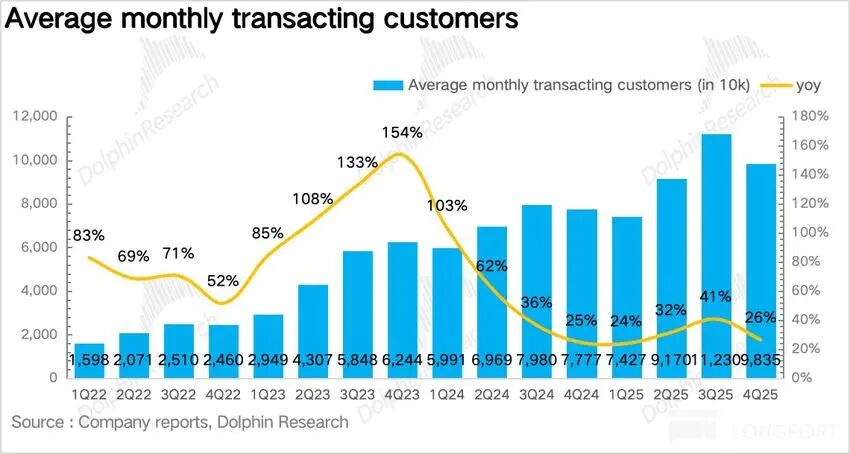 月活跃付费用户数增速放缓。Q4瑞幸月活跃付费用户数为9800万,同比提升27%,环比2、3季度明显放缓,由于外卖大战期间,平台高额补贴吸引了大量价格敏感型用户,补贴退潮后,这部分用户活跃度骤降,拉低整体用户增速,说明外卖用户的私域转化留存率并不算高。