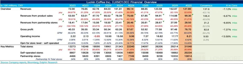瑞幸咖啡(LKNCY)于北京时间2026年2月26日下午美股盘前发布了2025年第四季度财报(截止2025年12月)。