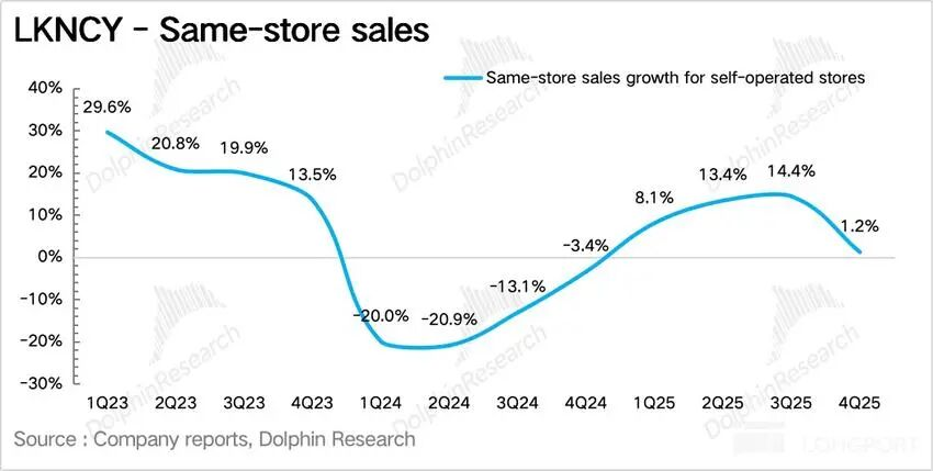 作为剔除新店影响后体现瑞幸单店内生增长的核心指标同店营业额增速(SSSG)同比提升1.2%,环比三季度明显下滑,拆分来看: